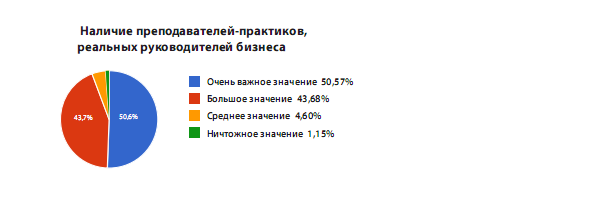 Надо отметить, что, кроме отзывов о работе бизнес-школы, предприниматели отметили необходимость ведения программ преподавателями-практиками, реальными руководителями бизнеса. На это обращают внимание почти 95% опрошенных.