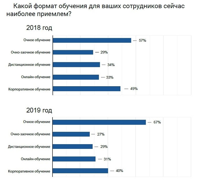 Большая часть компаний планирует обучение в очном (67%) и корпоративном (40%) форматах. Дистанционное и онлайн-обучение пока уступают им в популярности (их выберут 31% и 29% опрошенных). При этом большинство компаний в 2020 году планирует учить своих сотрудников как минимум в двух разных форматах.